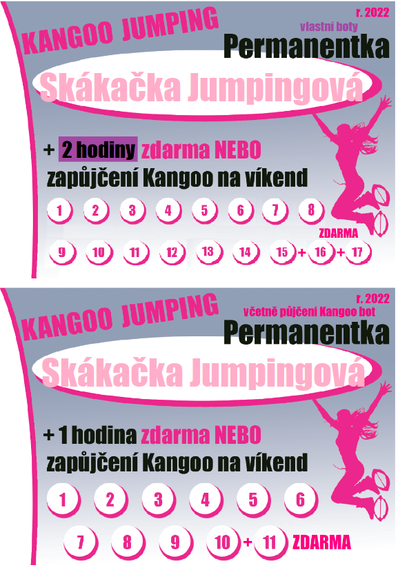 půjčení Kangoo bot (botky si předem rezervujte). POZOR NOVINKA - možnost cvičení i bez skákacích bot jen v teniskách, užijte si cvičení s námi a vyzkoušejte bez botek 🙂 zaplatíte 100 Kč.Také možnost přijít společně s dětmi (máme botky od vel. 30) - pro vaše děti je cena cvičení i s botkama 80 Kč/hod. Pokud mají vlastní botky platí 40 Kč a pokud navštěvují náš dětský kroužek, mají cvičení zdarma. Na kroužek můžete své dítě přihlásit kdykoli!